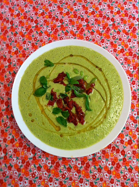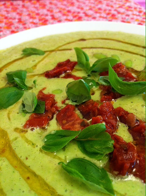 Blend all the ingredients together well until smooth and creamy, eat immediately whilst still warm. To reheat, simmer on a low temperature, in a saucepan until warm to not bring to the boil. Garnish with sundried tomatoes and fresh basil or herbs of your choice. Drizzle with flaxoil or olive oil.
